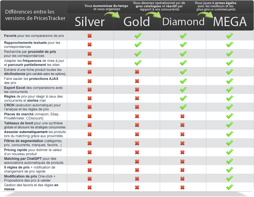 La version MEGA permet également d'améliorer les matching grâce a deux options : l'association par proximité permet d'associer automatiquement les produits de vos concurrents avec les votre grâce a des règles sur de nombreux critères et le Matching Google, vous permet de rechercher un produit concurrent sur Google en un clic et de l'associer avec votre produit grâce a une extension Firefox.